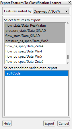 Экспортируйте набор функций в Classification Learner, чтобы можно было обучить классификационную модель. На вкладке Функции Ranking нажмите Экспорт > Экспорт Функций к Classification Learner. Выберите все функции, имеющие One-Way ANOVA метрика больше 1. Этот выбор включает все функции из pressure_ps_spec/Data_Wn2 и вверх.