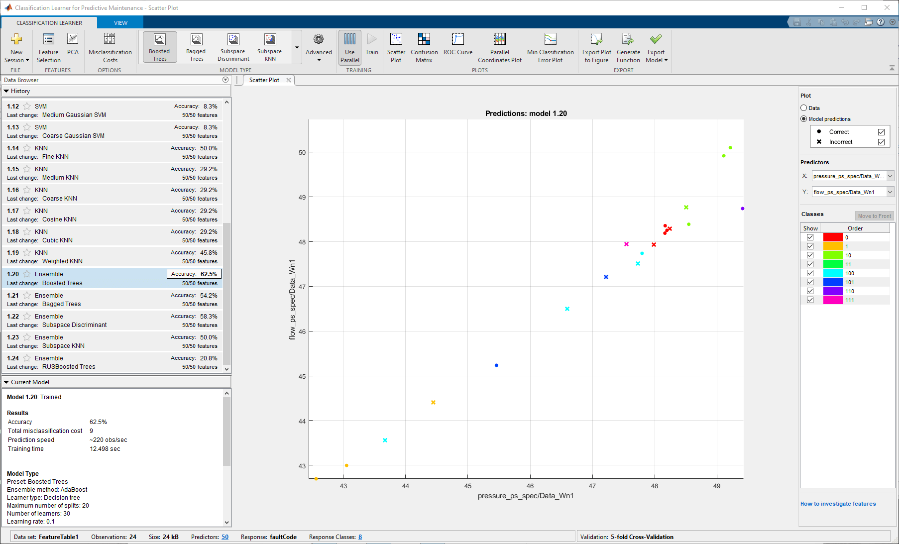 Для этого сеанса самая высокая точность модели, достигнутая обоими Bagged Trees и RUSBoosted Trees, составляет около 80%. Снова, ваши результаты могут варьироваться, но они все еще должны отражать увеличение лучшей точности.