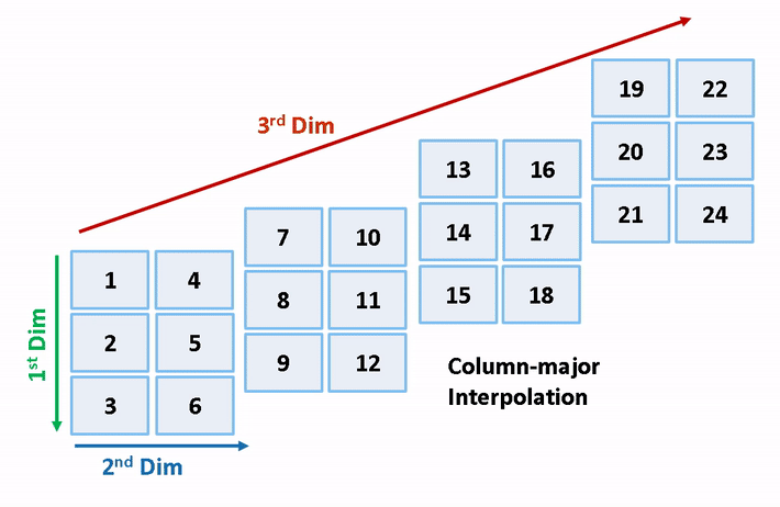 Алгоритмы основной и основной строки различаются только в порядке интерполяции. В некоторых случаях из-за различного порядка операции на том же наборе данных вы можете испытывать незначительные числовые различия в выходах алгоритмов column-major и row-major. Для двумерных интерполяционных таблиц, используемых в модели примера, алгоритм интерполяции проиллюстрирован здесь.