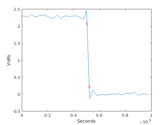 возвращает вектор f = falltime(x)f содержащее время каждого перехода двухуровневого сигнала x принимает, чтобы перейти от уровня ссылки 10% к уровню ссылки 90% (См. Процент Ссылки уровней). Для определения переходов, falltime оценивает уровни состояния входа волны с помощью гистограммы. falltime определяет все области, которые пересекают контур нижнего состояния высокого состояния и контура верхнего состояния низкого состояния. Контуры низкого и высокого состояний выражаются как уровень состояния плюс или минус кратное различие между уровнями состояния (См. Допуски уровня состояния). Поскольку falltime использует интерполяцию, f могут содержать значения, которые не соответствуют моментам дискретизации двухуровневого сигнала x.