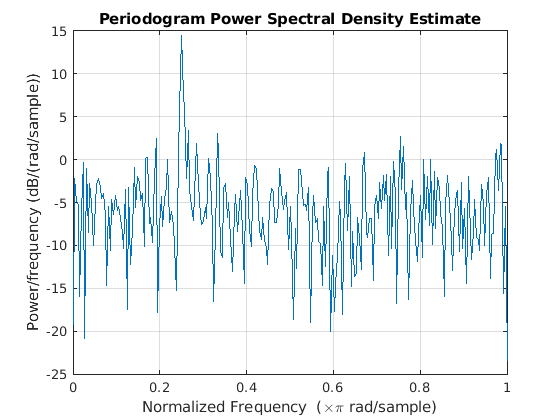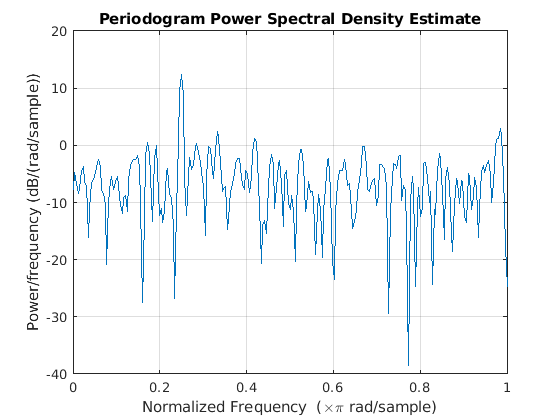 возвращает оценку спектральной плотности степени пародограммы (PSD), pxx = periodogram(x)pxx, входного сигнала, x, найденный с использованием прямоугольного окна. Когда x является вектором, он рассматривается как один канал. Когда x является матрицей, PSD вычисляется независимо для каждого столбца и хранится в соответствующем столбце pxx. Если x является реальным, pxx является односторонней оценкой PSD. Если x является комплексным, pxx является двусторонней оценкой PSD. Число точек, nfftв дискретном преобразовании Фурье (DFT) это максимум 256 или следующая степень двойки, больше длины сигнала.