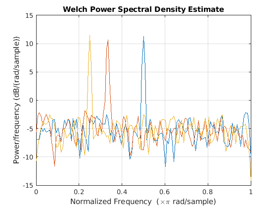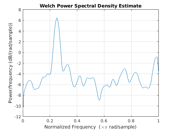 возвращает оценку спектральной плотности степени (PSD), pxx = pwelch(x)pxx, входного сигнала, x, найденный с использованием перекрытой оценки среднего сегмента Welch. Когда x является вектором, он рассматривается как один канал. Когда x является матрицей, PSD вычисляется независимо для каждого столбца и хранится в соответствующем столбце pxx. Если x является реальным, pxx является односторонней оценкой PSD. Если x является комплексным, pxx является двусторонней оценкой PSD. По умолчанию x разделяется на самые длинные возможные сегменты, чтобы получить как близкие, но не превышающие 8 сегментов с 50% перекрытием. Каждый сегмент окончается окном Хэмминга. Модифицированные периодограммы усредняются для получения оценки PSD. Если вы не можете разделить длину x точно в целое число сегментов с 50% перекрытием, x соответственно усечено.
