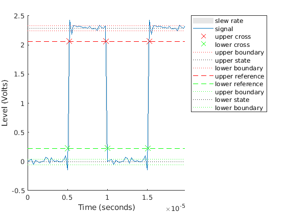 slewrate(...) строит график формы двухуровневого сигнала и темнеет области каждого перехода, где вычисляется скорость нарастания. График помечает переходы нижнего и верхнего эталонного уровня и соответствующие эталонные уровни. График указывает уровни состояния и соответствующие нижние и верхние допуски.
