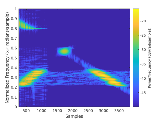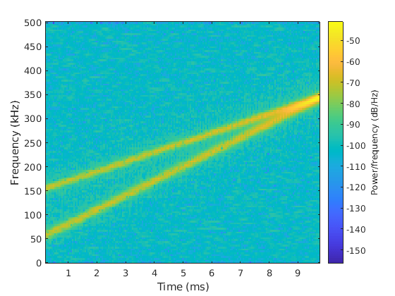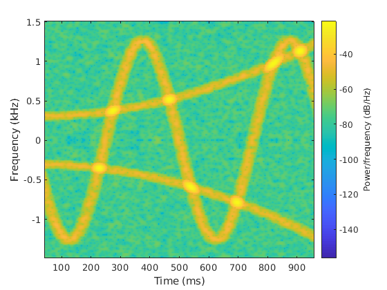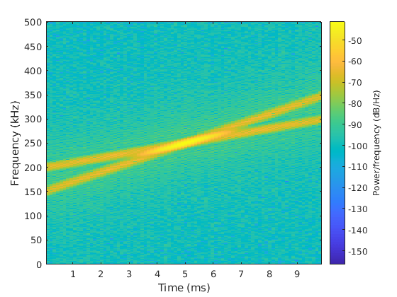 [___] = xspectrogram(___, возвращает краткосрочные оценки взаимной спектральной плотности мощности, если spectrumtype)spectrumtype задается как 'psd' и возвращает краткосрочные оценки степени спектра, если spectrumtype задается как 'power'.