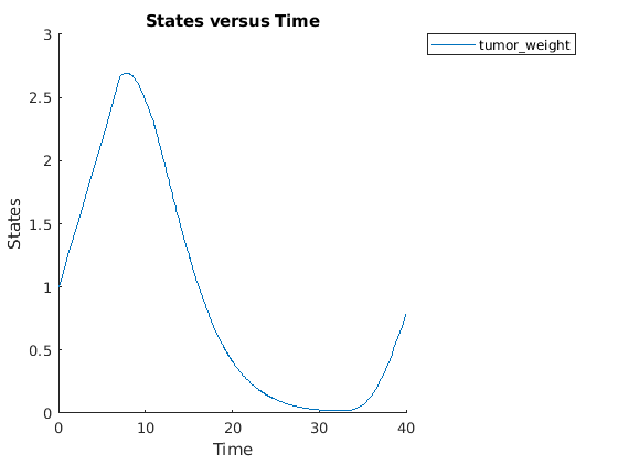 cs.RuntimeOptions.StatesToLog = 'tumor_weight';Симулируйте модель и постройте график профиля роста опухоли.