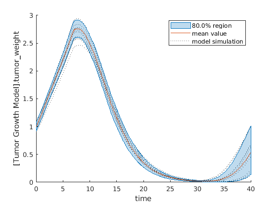 sbioloadproject tumor_growth_vpop_sa.sbprojПолучите вариант с предполагаемыми параметрами и дозой для применения к модели.