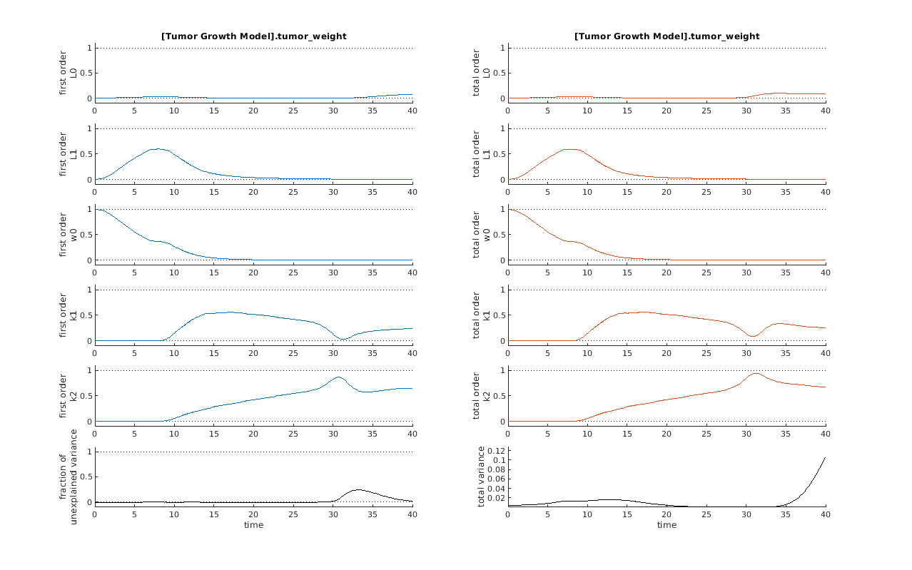 Из графиков индексов Соболь, параметров L1 и w0 по-видимому, являются наиболее чувствительными параметрами к весу опухоли до применения дозы при t = 7. Но после применения дозы k1 и k2 стать более чувствительными параметрами и внести наибольший вклад в стадию дозы веса опухоли. График общего отклонения также показывает большое отклонение для стадии после дозы в t > 35, чем для стадии до дозы роста опухоли, что указывает на то, что k1 и k2 возможно, более важными параметрами для дальнейшего исследования. Доля необъяснимого отклонения показывает некоторое отклонение около t = 33, но график полного отклонения показывает небольшое отклонение при t = 33, что означает, что необъяснимое отклонение может быть незначительной. Доля необъяснимого отклонения вычисляется как 1 - (сумма всех индексов Соболя первого порядка), и общее отклонение вычисляется с помощью var(response), где response - реакция модели в каждой временной точке.