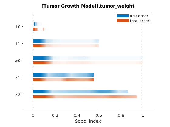 ![Figure contains an axes. The axes with title [Tumor Growth Model].tumor_weight contains 22 objects of type patch, line. These objects represent first order, total order.](../../examples/simbio/win64/PerformGSAByComputingFirstAndTotalSobolIndicesExample_05.png)