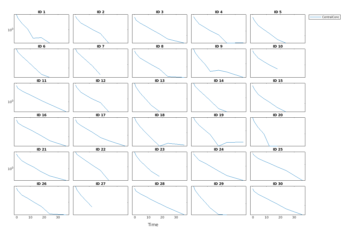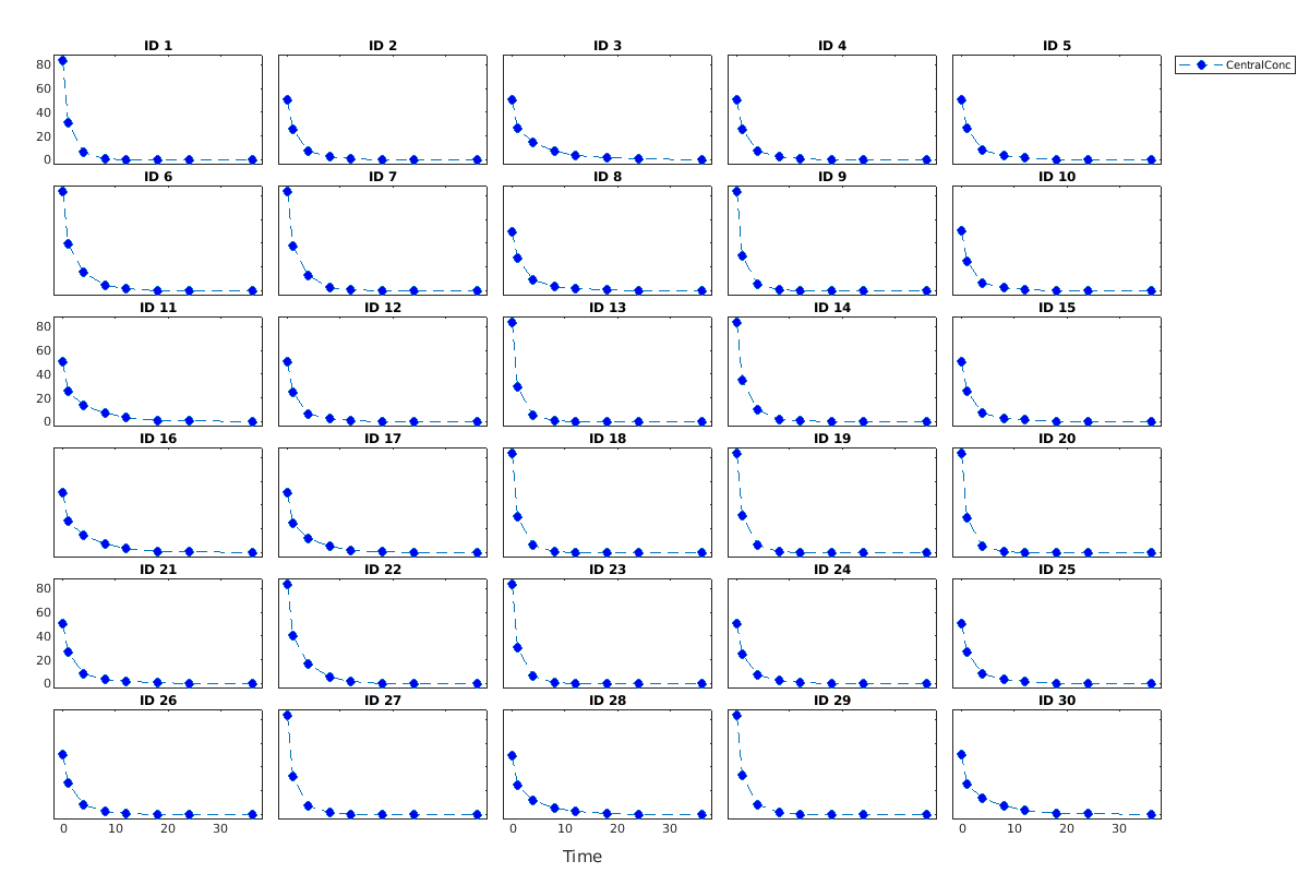 строит графики каждой группы на trellisplot = sbiotrellis(simData,fcnHandle,xCol,yCol)simData в свой собственный подграфик. sbiotrellis создает подграфик путем вызова указателя на функцию, fcnHandle с входными параметрами, заданными столбцами xCol и yCol. The fcnHandle может быть пустым ('' или []). Если он пуст, график времени по умолчанию создается с помощью указателя @plot.
