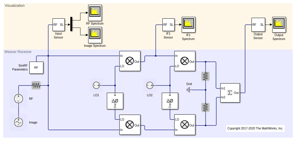 Модель ex_simrf_ir выполняет отклонение изображений с помощью архитектуры вивер. Приемник downconverts сигналы
