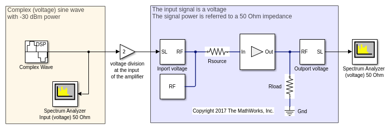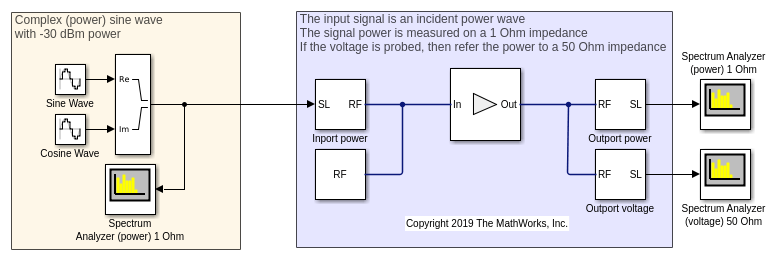 В этой модели сигнал Simulink интерпретируется как сигнал Напряжения. При измерении степени сигнала анализатором спектра смотрите измерение на 50 Ом. Заметьте, что два источника и «Real-Imag to Complex» степени заменяются с помощью одного блока Sine Wave со свойством Output complexity установить на «Комплексный».