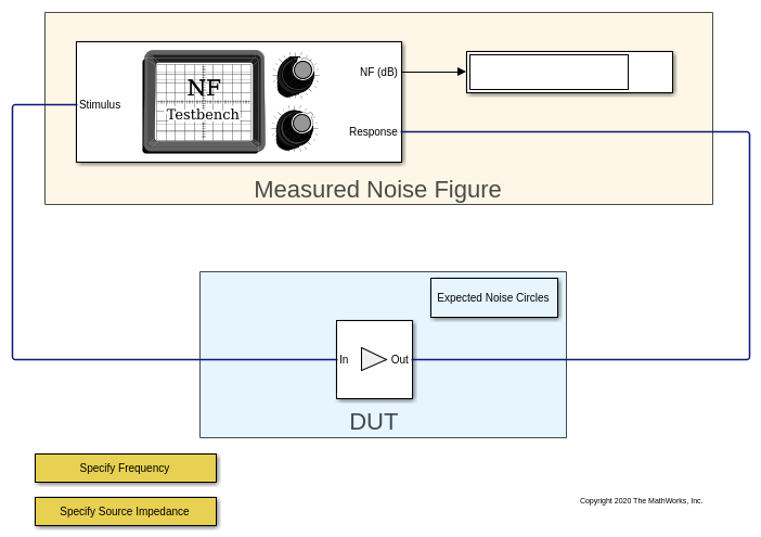 Можно заменить усилитель в модели любой другой системой RF Blockset и измерить его шумовой рисунок. В случае, если система зависит от частоты, можно изменить частоту для измерений, дважды кликнув по Specify Frequency подсистема и определение желаемой частоты. Эта частота также используется для построения графиков шумовых кругов усилителя.