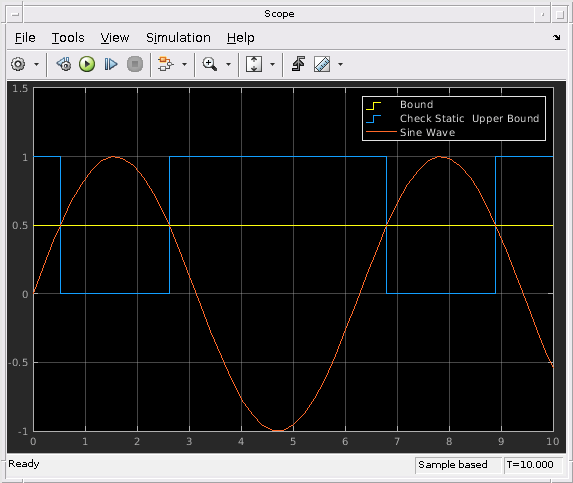 The Check Static Upper Bound block checks if an input signal is less