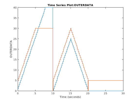Сигнал, подающий возможности в ссылочной модели, также регистрируется. Записанные данные доступны в рабочем пространстве MATLAB под переменной subOut. Можно проверить, что данные в topOut.getElement('OUTERDATA') и subOut.getElement('INNERDATA') то же самое.