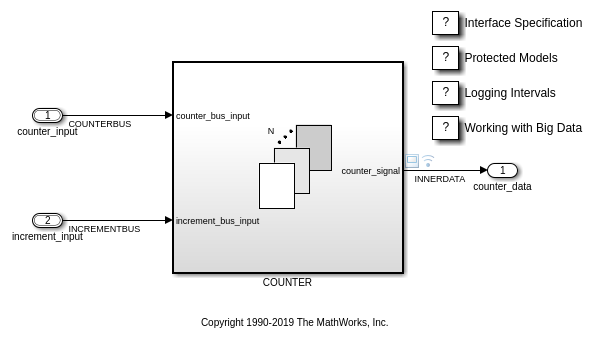 Блок Inport с именем increment_input аналогично сконфигурирован, чтобы использовать Bus объект с именем INCREMENTBUS.