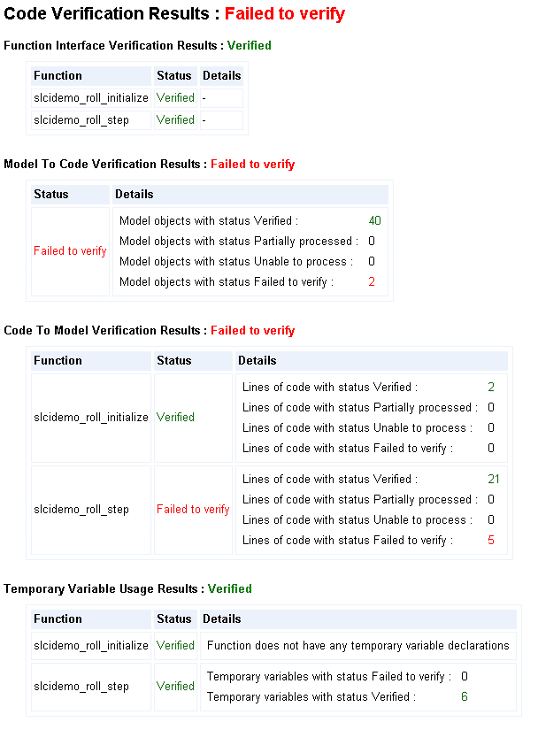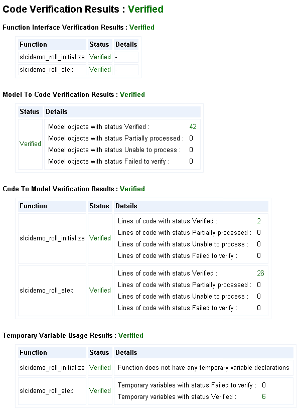 Следующий пример выдержки из отчета показывает результаты верификации кода для сгенерированного кода, который структурно эквивалентен его соответствующей модели. Элементы модели, которые находятся вне поддерживаемого подмножества языка и соответствующих фрагментов кода, указаны как «Невозможно обработать» в отчете о верификации кода.