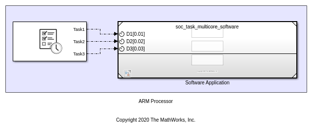 Эта модель моделирует программное обеспечение, работающее на процессоре ARM, с 3 задачами, управляемыми таймером. Блок Task Manager планирует выполнение задач внутри Software Application Model Reference блок. Задачи 1, с периодом 0.01 секунд, выполняется на Core 0. Задачи 2 и 3 с периодами 0.02 и 0.03 секунд, соответственно, выполнения от Core 1.