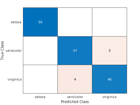The confusion matrix chart shows that three measurements in the versicolor class are misclassified. All the measurements belonging to setosa and virginica are classified correctly.