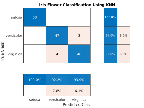 cm.Title = 'Iris Flower Classification Using KNN';Add column and row summaries.
