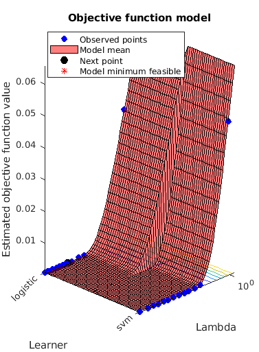 rng default Mdl = fitclinear(X,Ystats,'ObservationsIn','columns','Solver','sparsa',... 'OptimizeHyperparameters','auto','HyperparameterOptimizationOptions',... struct('AcquisitionFunctionName','expected-improvement-plus'))