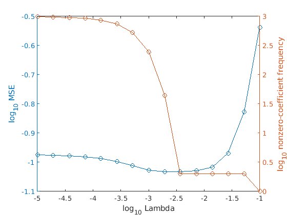 figure [h,hL1,hL2] = plotyy(log10(Lambda),log10(mse),... log10(Lambda),log10(numNZCoeff)); hL1.Marker = 'o'; hL2.Marker = 'o'; ylabel(h(1),'log_{10} MSE') ylabel(h(2),'log_{10} nonzero-coefficient frequency') xlabel('log_{10} Lambda') hold off