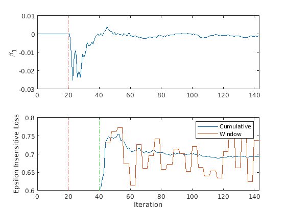 figure; subplot(2,1,1) plot(beta1) ylabel('\beta_1') xlim([0 nchunk]); xline(Mdl.EstimationPeriod/numObsPerChunk,'r-.'); subplot(2,1,2) h = plot(ei.Variables); xlim([0 nchunk]); ylabel('Epsilon Insensitive Loss') xline(Mdl.EstimationPeriod/numObsPerChunk,'r-.'); xline((Mdl.EstimationPeriod + Mdl.MetricsWarmupPeriod)/numObsPerChunk,'g-.'); legend(h,ei.Properties.VariableNames) xlabel('Iteration')