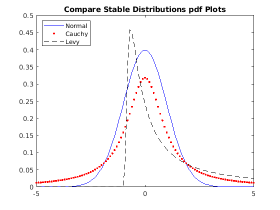x = -5:.1:5; pdf_norm = pdf(pd_norm,x); pdf_cauchy = pdf(pd_cauchy,x); pdf_levy = pdf(pd_levy,x);