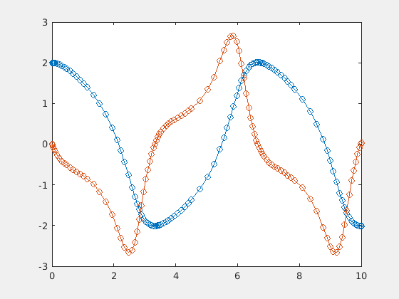xy0 = [2; 1]; % x(t) and y(t) xyp0 = [0; 0.05*xy0(2)]; % derivatives of x(t) and y(t)
