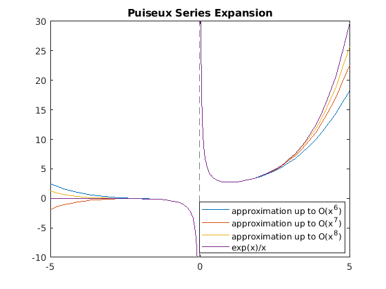 fplot([s6 s7 s8 f]) legend('approximation up to O(x^6)','approximation up to O(x^7)',... 'approximation up to O(x^8)','exp(x)/x','Location', 'Best') title('Puiseux Series Expansion')