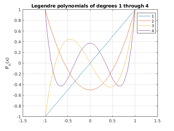 syms x y fplot(legendreP(1:4, x)) axis([-1.5 1.5 -1 1]) grid on ylabel('P_n(x)') title('Legendre polynomials of degrees 1 through 4') legend('1','2','3','4','Location','best')