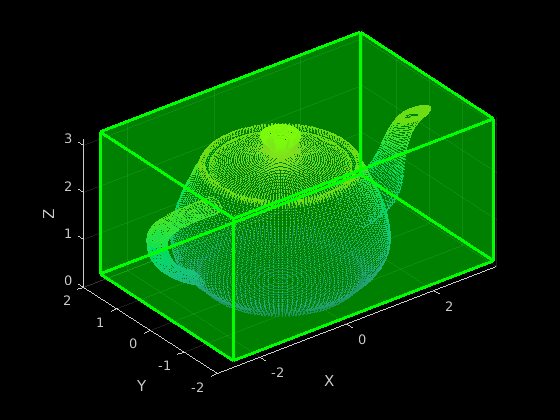 ptCloud = pcread('teapot.ply');Задайте матрицу поворота и 3-D преобразование, чтобы повернуть облако точек и связанный кубоид на 5 степени.