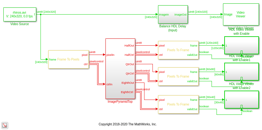 modelname = 'ImagePyramidHDL'; open_system(modelname); set_param(modelname,'SampleTimeColors','on'); set_param(modelname,'SimulationCommand','Update'); set_param(modelname,'Open','on'); set(allchild(0),'Visible','off');
