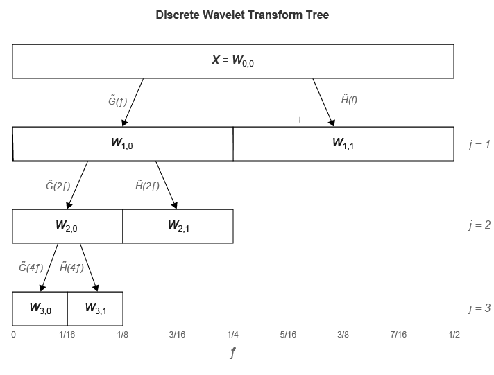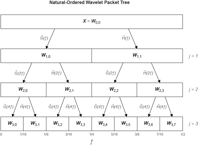 При преобразовании вейвлет-пакета операции фильтрации также применяются к коэффициентам вейвлет, или детализации. Результатом является то, что вейвлет обеспечивают поддиапазонную фильтрацию входного сигнала в постепенно более мелкие интервалы равной ширины. На каждом уровне, , частотная ось [0,1/2] разделена на поддиапазоны. Поддиапазоны в hertz на уровне j приблизительно