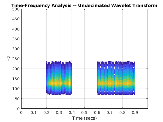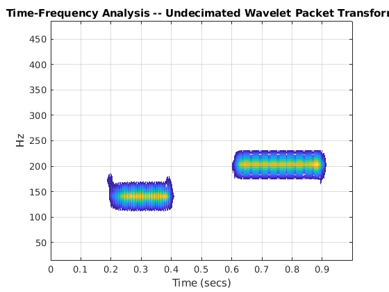 dt = 0.001; t = 0:dt:1-dt; x = ... cos(2*pi*150*t).*(t>=0.2 & t<0.4)+sin(2*pi*200*t).*(t>0.6 & t<0.9); y = x+0.05*randn(size(t)); [wpt,~,F] = modwpt(x,'TimeAlign',true); contour(t,F.*(1/dt),abs(wpt).^2) grid on xlabel('Time (secs)') ylabel('Hz') title('Time-Frequency Analysis -- Undecimated Wavelet Packet Transform')