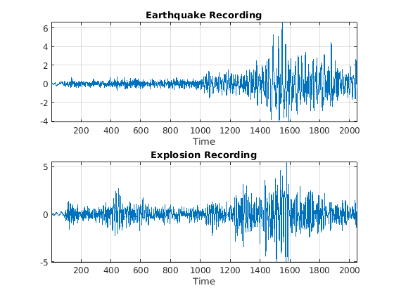 load EarthQuakeExplosionData subplot(2,1,1) plot(EarthQuakeExplosionData(:,3)) xlabel('Time') title('Earthquake Recording') grid on axis tight subplot(2,1,2) plot(EarthQuakeExplosionData(:,9)) xlabel('Time') title('Explosion Recording') grid on axis tight