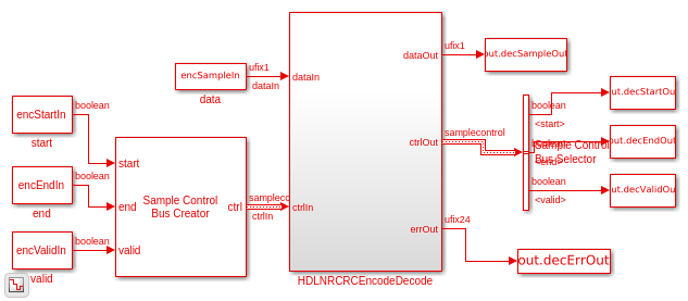 Блок NR CRC Decoder вычисляет контрольную сумму циклического контроля избыточности (CRC) и сравнивает ее с добавленной контрольной суммой CRC для каждой системы координат потоковых выборок данных. Если две контрольные суммы CRC не совпадают, блок сообщает об ошибке. Блок принимает и возвращает поток выборки данных с сопутствующими сигналами управления. Сигналы управления указывают на валидность выборок и контуров системы координат.