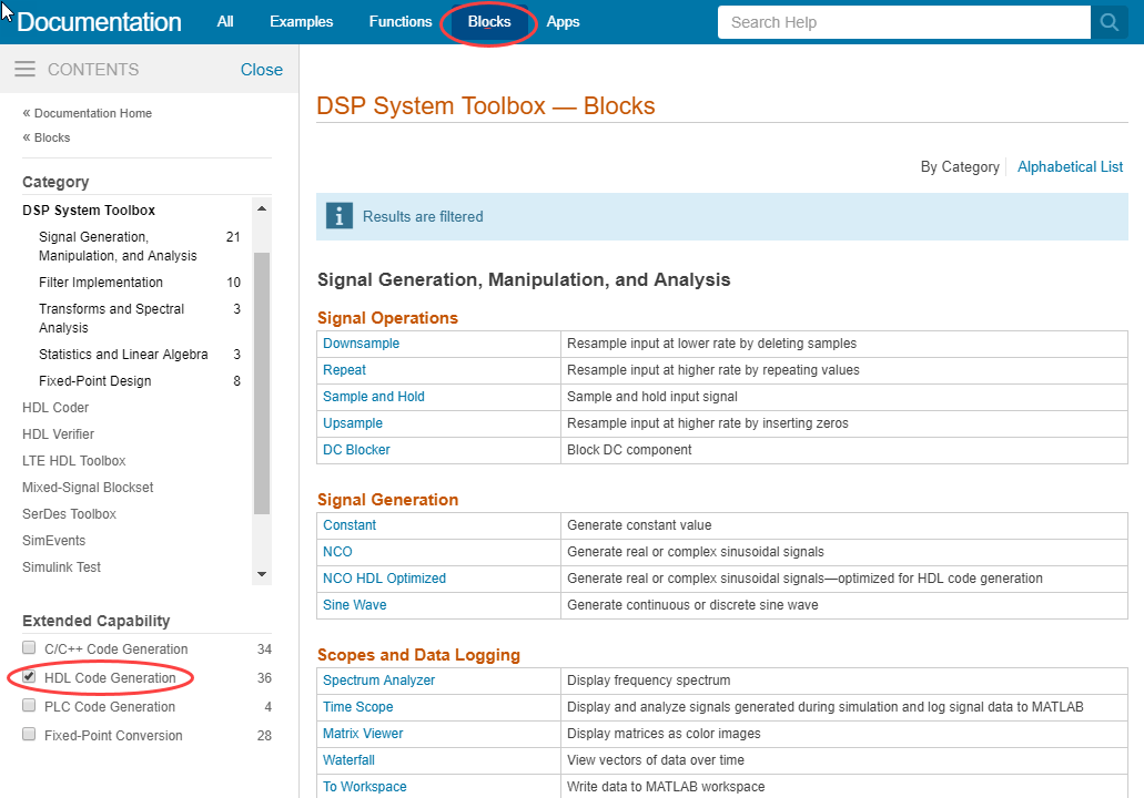 Можно также просмотреть блоки, поддерживаемые для генерации HDL-кода, в документации путем фильтрации списка ссылок на блоки. Щелкните Blocks на синей панели в верхней части окна справки, затем установите флажок HDL code generation в нижней части левого столбца. Блоки перечислены в соответствующих продуктах. Для перехода между продуктами и категориями можно использовать таблицу содержимого в левом столбце.