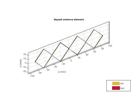 biquad антенна является центром, питаемым и симметричным вокруг его начала координат. Длина по умолчанию выбрана для рабочей частоты 2,8 ГГц.