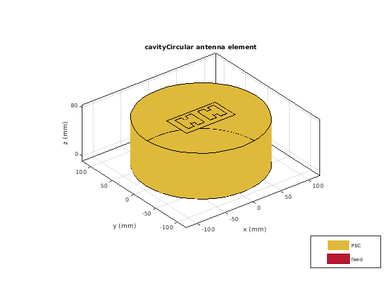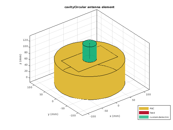 Используйте circularCavity объект создать проспект поддержанная полостью антенна. По умолчанию используемый возбудитель является диполем. Размерности выбраны для рабочей частоты 1 ГГц.