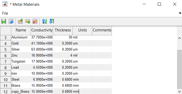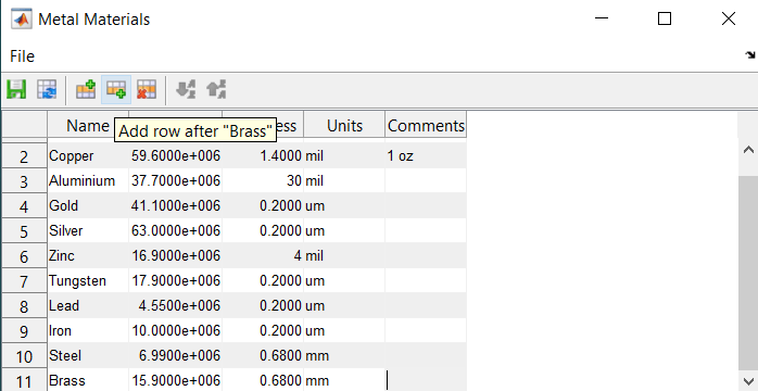Дублирующаяся запись металлического материала появляется ниже выбранной строки.