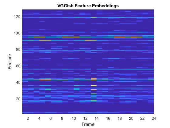 surf(features,'EdgeColor','none') view([90,-90]) axis([1 numFeatures 1 numFrames]) xlabel('Feature') ylabel('Frame') title('VGGish Feature Embeddings')