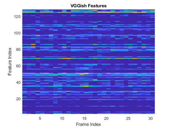 surf(features,'EdgeColor','none') view([90,-90]) axis tight xlabel('Feature Index') ylabel('Frame Index') title('VGGish Features')