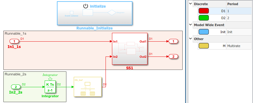 Сгенерированный код для модели планирует подуровни в модели. В этом примере, уровне для Inport блока In2_2s, зеленый уровень, подуровень. Сгенерированный код правильно передает данные между задачами, которые запускаются на различных уровнях.