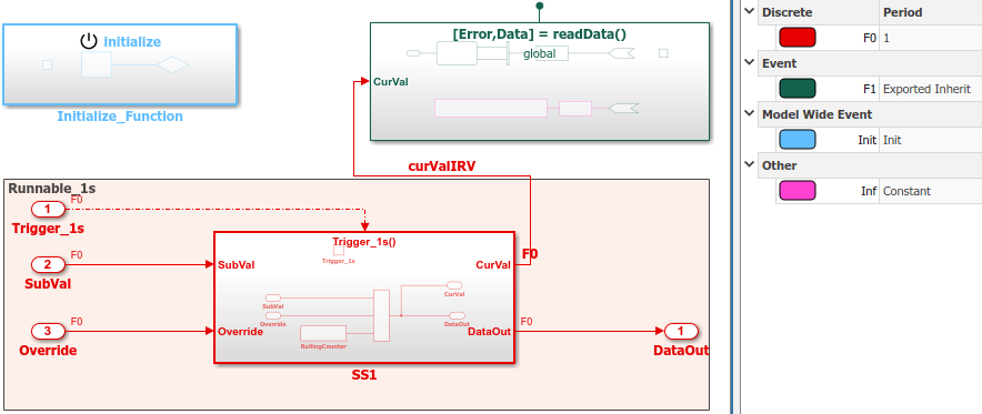 Модель включает Инициализировать Функциональный блок, который инициализирует единичную задержку в Runnable_1s к значению 0.