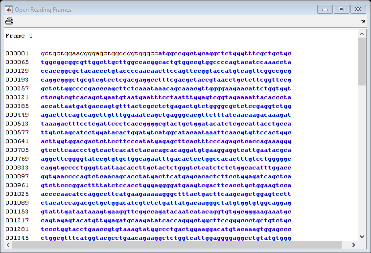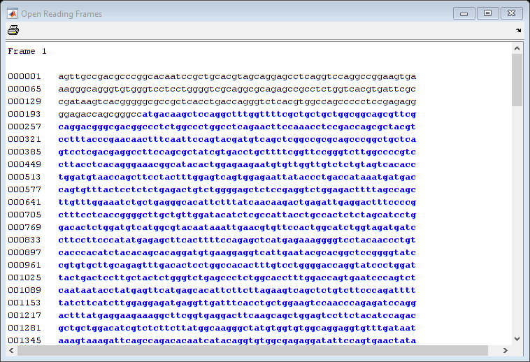 seqshoworfs создает структуру output humanORFs. Эта структура содержит положение запуска и кодонов остановки для всех открытых рамок считывания (ORFs) на каждой рамке считывания. Фигура отображает эти три рамки считывания с ORFs, окрашенным в синий, красный цвет, и зеленый. Заметьте, что самый длинный ORF находится в системе координат первого чтения.