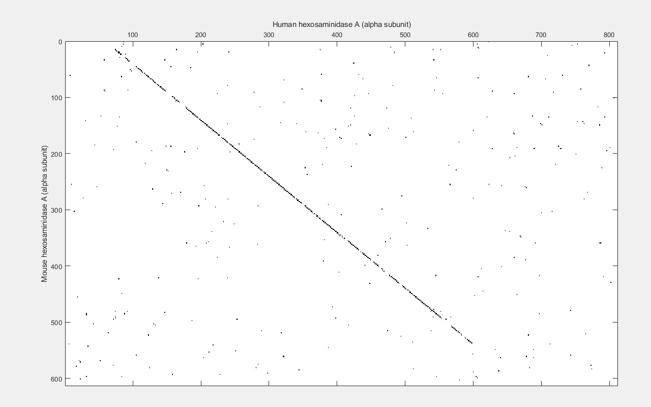 warning('off','bioinfo:seqdotplot:imageTooBigForScreen'); seqdotplot(mouseProtein,humanProtein,4,3); ylabel('Mouse hexosaminidase A (alpha subunit)') xlabel('Human hexosaminidase A (alpha subunit)') uif = gcf; uif.Position(:) = [100 100 1280 800]; % Resize the figure.