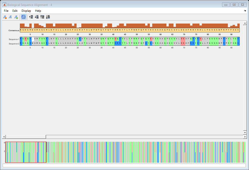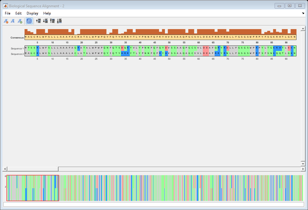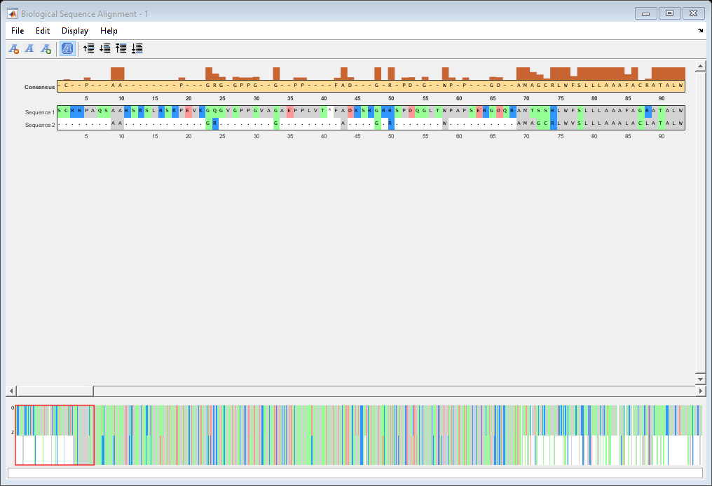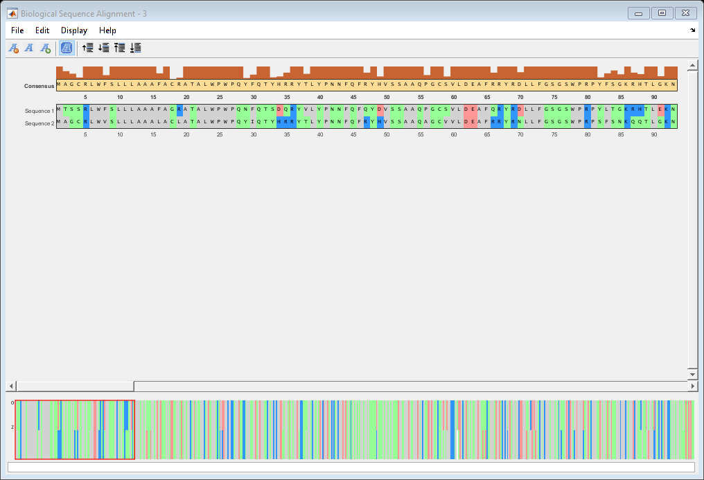 [GlobalScore_trim, GlobalAlignment_trim] = nwalign(humanProteinORF,mouseProteinORF); seqalignviewer(GlobalAlignment_trim);