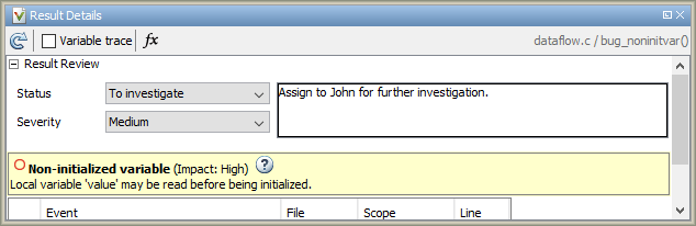 Панель Result Details также подсвечивает последовательность продвижения событий к результату. Например, для результата Non initialized variable, вы видите следующие события: