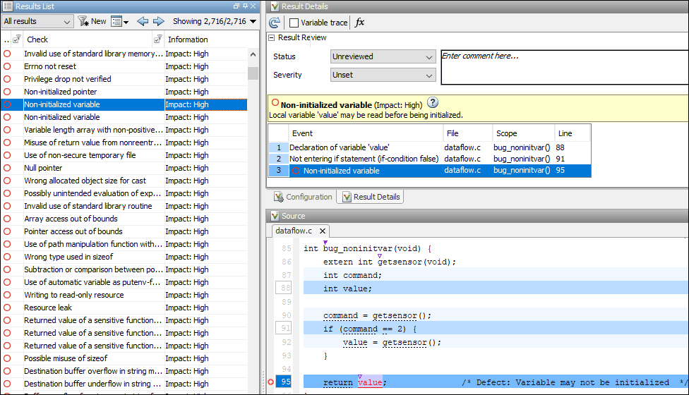 Polyspace® Bug Finder™ проверяет код C/C++ на дефекты, кодируя нарушения правила или уязвимости системы обеспечения безопасности. После того, как вы запускаете анализ, вы открываете результаты в пользовательском интерфейсе Polyspace (или если вы запустили анализ в Eclipse™, результаты, открытые в Eclipse).