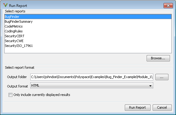 HTMLотчеты для результатов в C:\Users\johndoe\Documents\Polyspace\Examples\Bug_Finder_Example\Module_1\BF_Result, используйте следующие опции с командой: